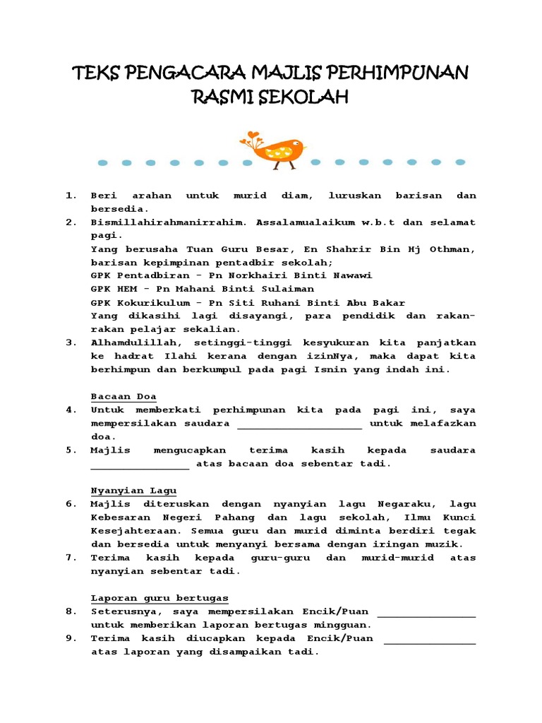 Teks mc majlis perhimpunan bulanan dalam bahasa inggeris. Yang berusaha,., tuan pengetua sekolah. Teks pengacara majlis perhimpunan sekolah dalam bahasa arab perokok i. Teks ucapan wakil pelajar hari graduasi teks ucapan hari anugerah cemerlang pelajar teks ucapan guru bertugas mingguan perhimpunan sekolah teks ucapan pengetua majlis pertandingan deklamasi sajak teks ucapan pengerusi ceramah ramadhan teks ucapan sambutan deepavali teks ucapan. Protokol majlis perhimpunan rasmi hari rabu aturcara perhimpunan rasmi: